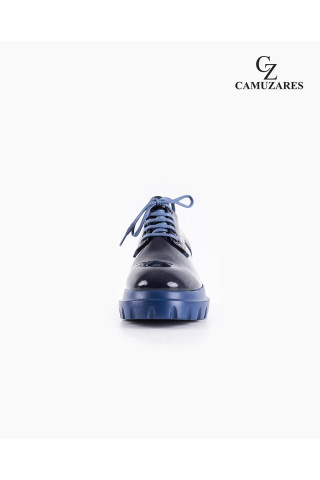Opis: Ženske, ravne cipele na vezivanje plavim pertlama, izrađene od teget, lakovane kože. Zaobljeni vrh. Kožni uložak. Neobičan, chic đon sa kramponima u plavoj boji. Naša preporuka je da ovaj model nosite uz džins i odela. Vašu odevnu kombinaciju možete upotpuniti tašnom i nakitom u plavoj boji. (pogledajte brend Doca). Idealan model za sve poslovne žene jer predstavlja spoj udobnosti i sofisticiranosti. Dostupan u još jednoj boji.