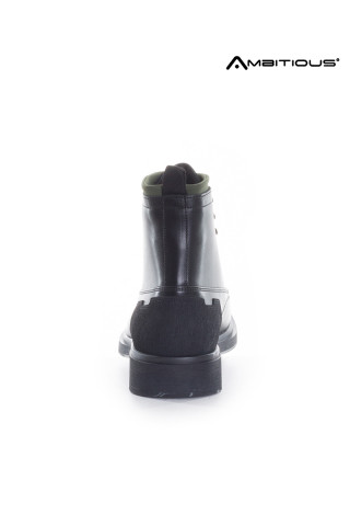 Opis: Muške, duboke, kožne cipele na vezivanje u crnoj boji ukrašene delovima od tekstila. Maslinasto zelena podstava. Jezičak za povlačenje. Zaobljeni vrh i neobičan crni đon. Naša preporuka je da se kombinuju uz trendy farmerke i sako. Model idealan za prve zimske dane.