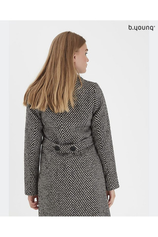 Ženski, ustručeni, crno beli kaput sa reverima. Dva kosa, paspulirana džepa u predelu kukova. Jedan red kopčanja dugmićima. Sa zadnje strane ukrasni kaiš sa dva dugmeta. Sastav: 70% Poliester, 30% Vuna