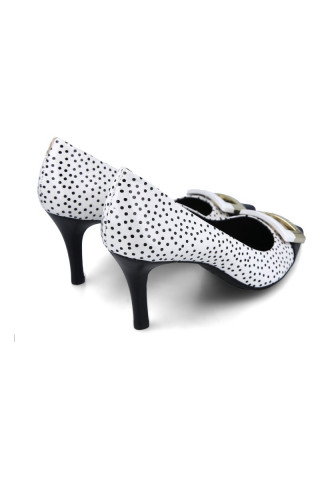 Opis: Kožne ženske cipele u crno belom tufna printu sa ukrasnom šnalom i potpeticom visine 7,5 cm