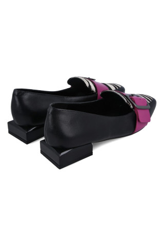 Opis: Kožne ženske ravne cipele u crnoj boji sa pink kaišem, zebra detaljima i geometrijskom potpeticom visine 2,5 cm