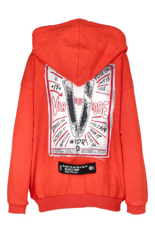 Opis: Pamučni ženski duks u narandžastoj boji sa kapuljačom, zipom i atraktivnom aplikacijom na leđima