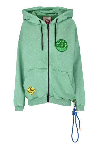 Opis: Pamučni ženski duks u svetlo zelenoj boji sa zipom, kapuljačom i logo printom