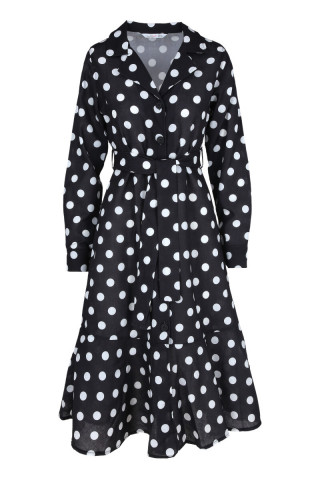 Opis: Pamučna haljina dugih rukava u crno-belom tufanstom dezenu sa karnerom, kaišem i kopčanjem na dugmiće