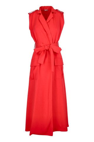Opis: Duga haljina košulja u koral crvenoj boji sa reverima, džepovima i kaišem