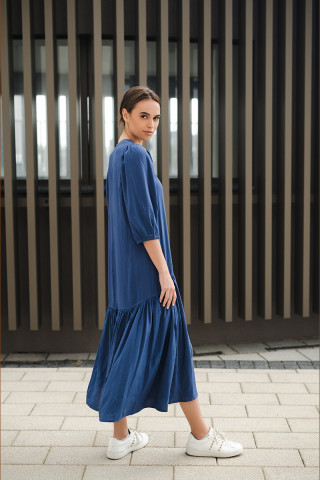 Opis: Pamučna duga haljina u plavoj boji sa Ve izrezom i širokim karnerom na dnu