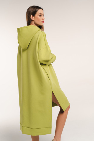 Opis: Ženski duks-haljina asimetrične dužine u kivi boji sa kapukjačom i bočnim šlicevima