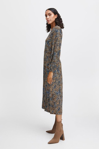 Opis: Midi haljina od prirodne, ekološki proizvedene viskoze u šarenom dezenu sa Ve izrezom i dugim rukavima