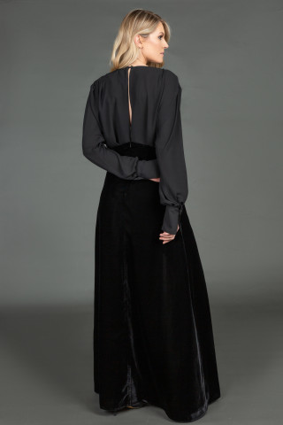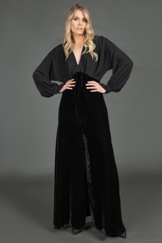 Opis: Duga haljina u crnoj boji sa miš dugačkim rukavima, Ve izrezom i visokim strukom