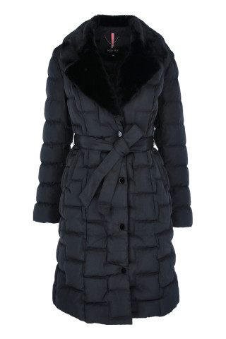 Opis: Duga ženska štepana jakna sa eko krznom u crnoj boji