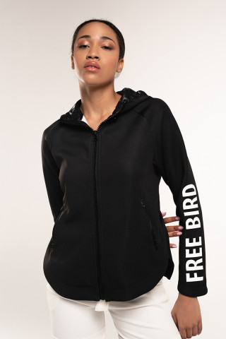 Opis: Ženska jakna od skuba materijala u crnoj boji sa kapuljačom, zipom i printom na rukavu i leđima