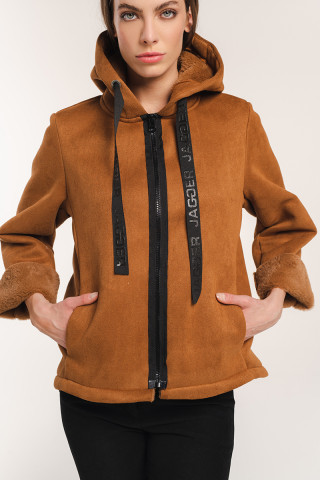 Opis: Ženska jakna u kamel boji sa kapuljačom, zipom i printom na leđima