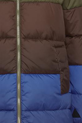 Opis: Dugačka ženska multicolor jakna sa štepovima, kapuljačom i zipom