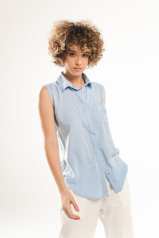 Opis: Ženska košulja bez rukava od prirodnog materijala u baby plavoj boji
