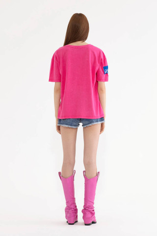 Opis: Pamučna ženska majica u pink boji sa kratkim rukavima i printom