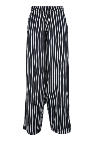 Opis: Ženske pantalone od prirodnog materijala u crno-belom dezenu sa spuštenim turom i lastiš pojasom