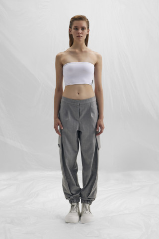 Opis: Ženske kargo pantalone u sivoj boji sa lastišem na nogavicama i bočnim džepovima