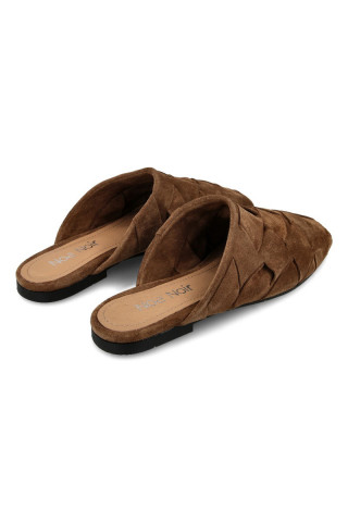 Opis: Ženske zatvorene ravne papuče od isprepletane prevrnute kože u braon boji
