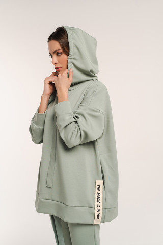Opis: Ženski oversized duks u mint zelenoj boji sa kapuljačom i logo trakom
