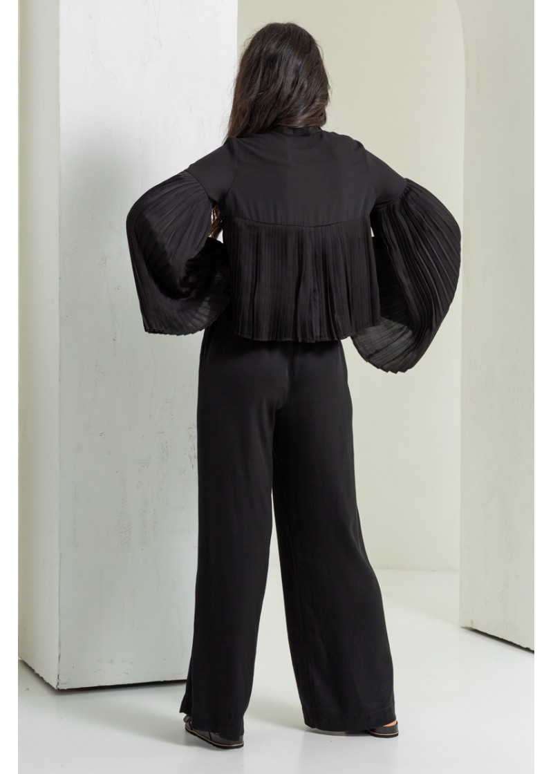 Opis: Ženska plisirana bluza sa dugim trapezastim rukavima u crnoj boji