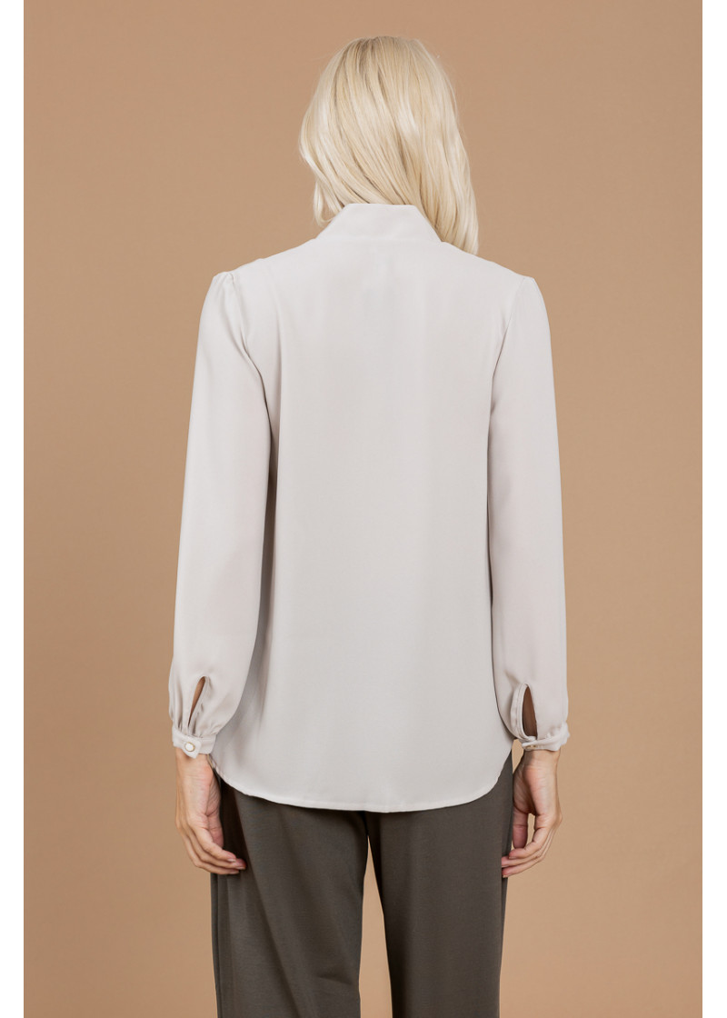 Opis: Ženska bluza u boji vanile sa dugim rukavima i nabranim naramenicama