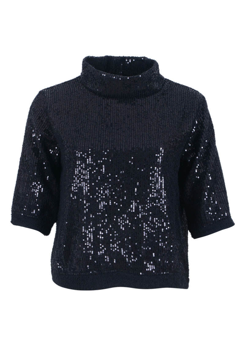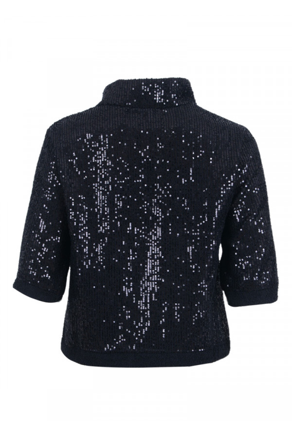 Opis: Ženska bluza u crnoj boji sa 3/4 rukavima, prišivenim šljokicama i polurol okovratnikom