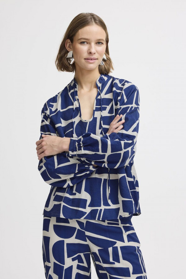 Opis: Ženska bluza u teget boji sa dugim rukavima i all over printom