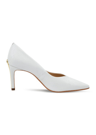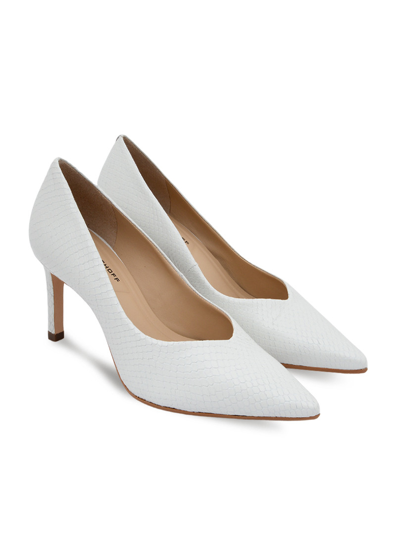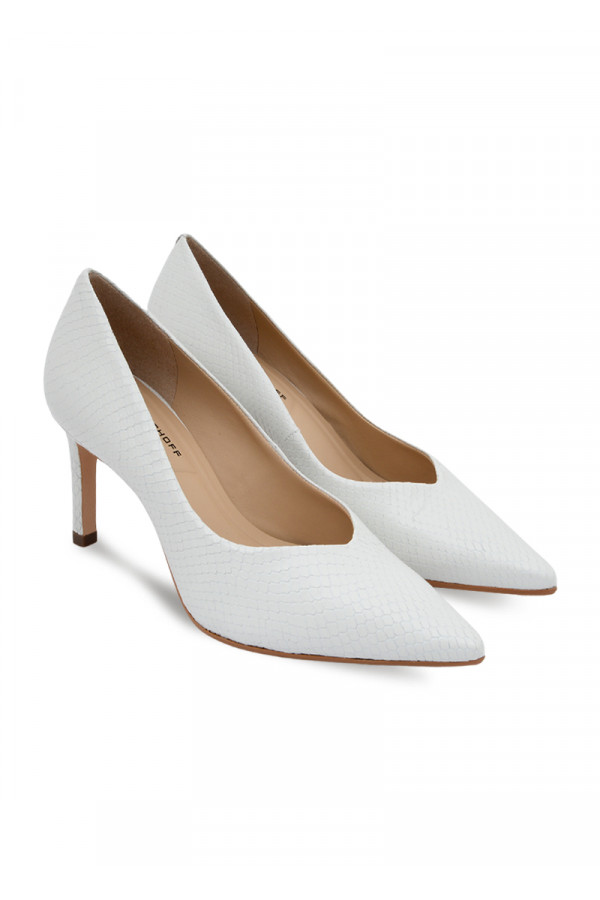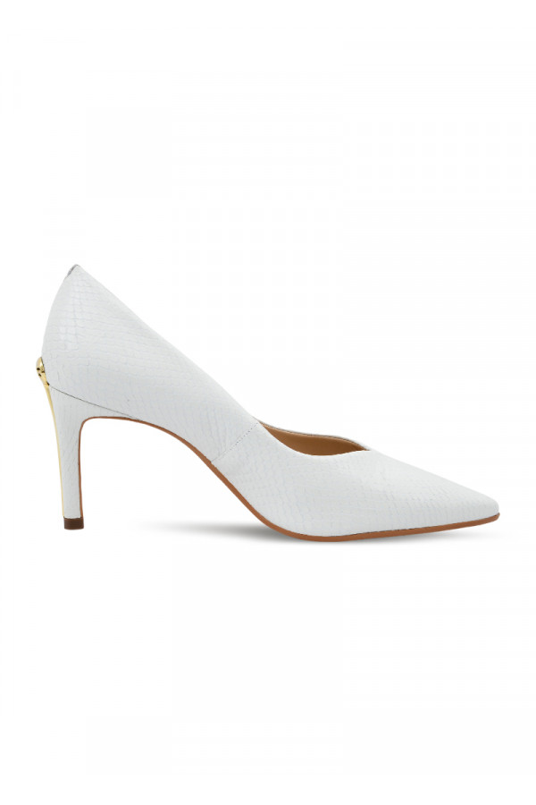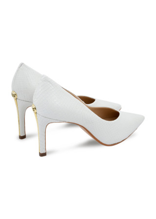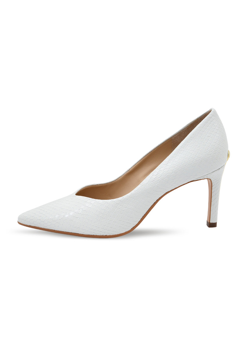 Opis: Kožne ženske cipele u beloj boji sa špicastim vrhom, zlatnim detaljem na peti i potpeticom visine 8 cm