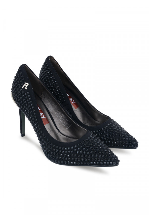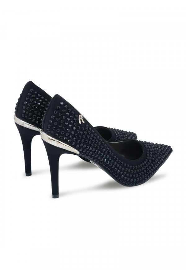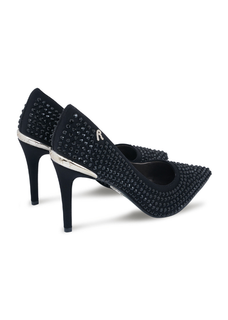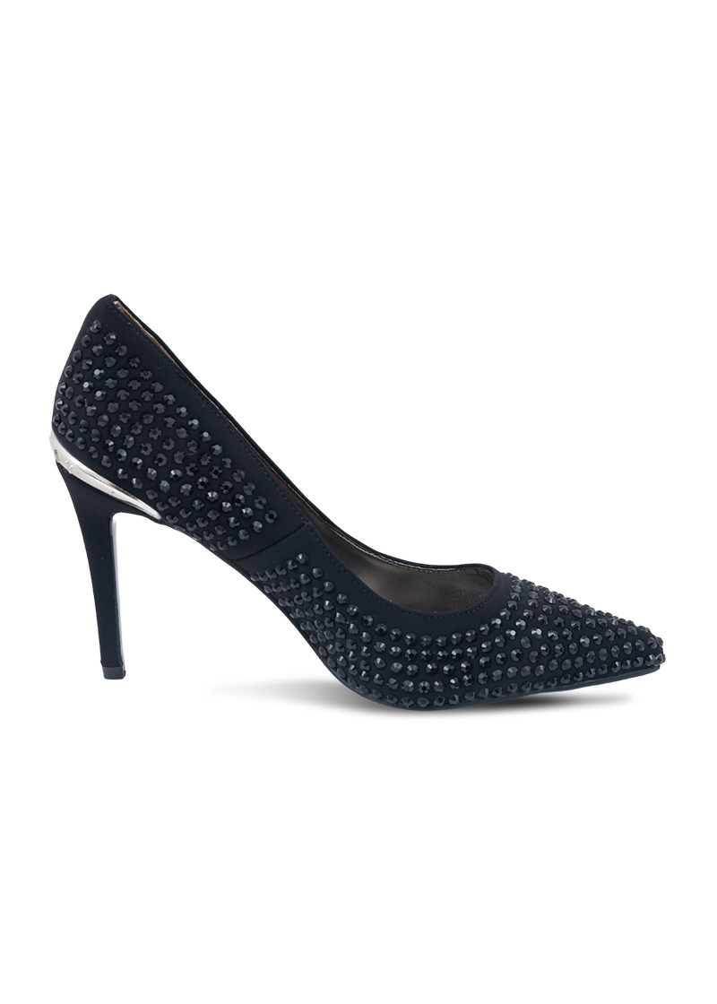 Opis: Ženske salonke u crnoj boji sa nitnama, visokom potpeticom i monogram znakom