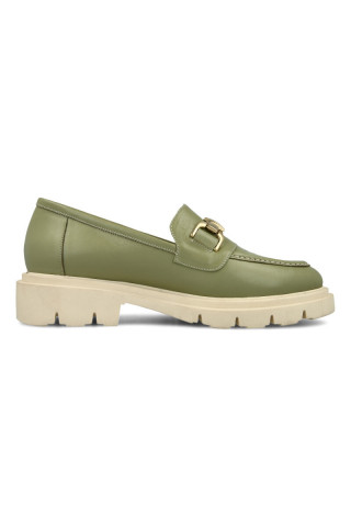 Opis: Kožne ženske ravne cipele u maslina zelenoj boji sa naglašenim đonom i šnalom u boji zlata