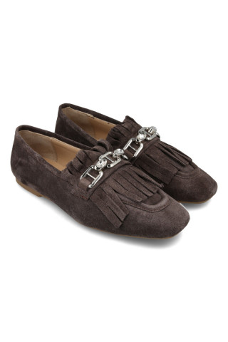 Opis: Kožne ravne ženske cipele u tamno braon boji sa resama i šnalom u boji srebra