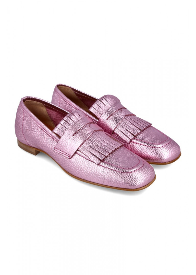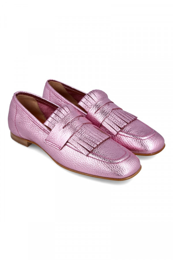 Opis: Kožne ženske ravne cipele autentičnog dizajna u svetlo roza boji sa metalik premazom i resama