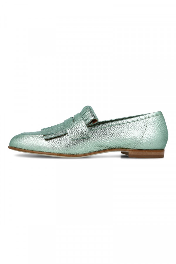 Opis: Kožne ženske ravne cipele autentičnog dizajna u svetlo smaragdno zelenoj boji sa metalik premazom i resama