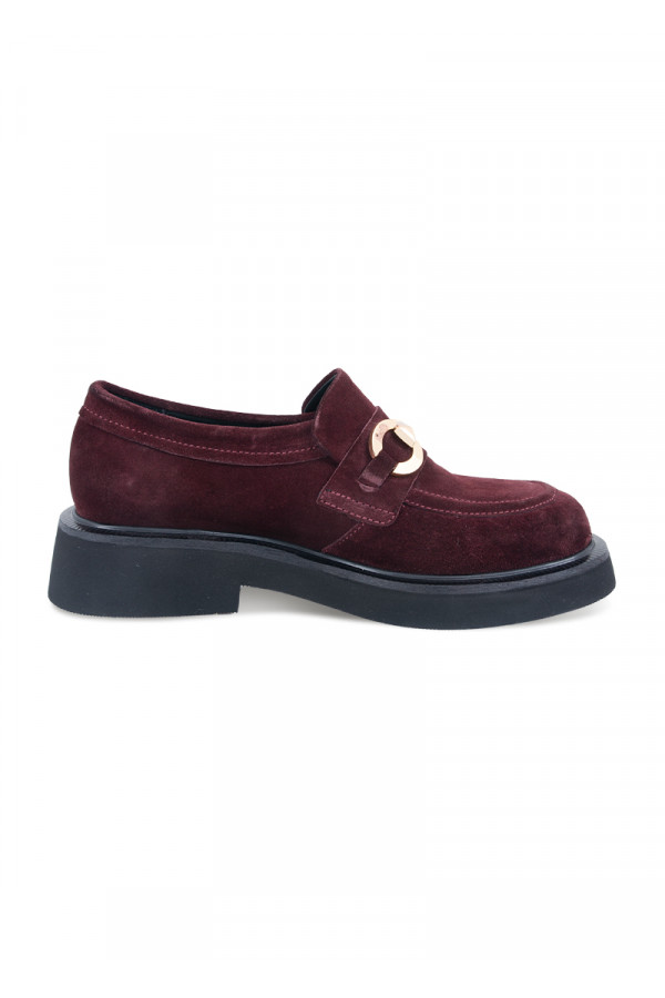 Opis: Ravne ženske cipele od prevrnute kože u bordo boji sa metalnom šnalom