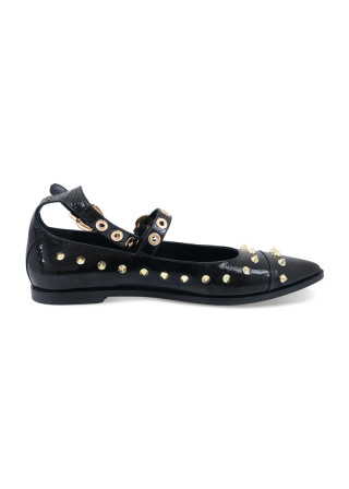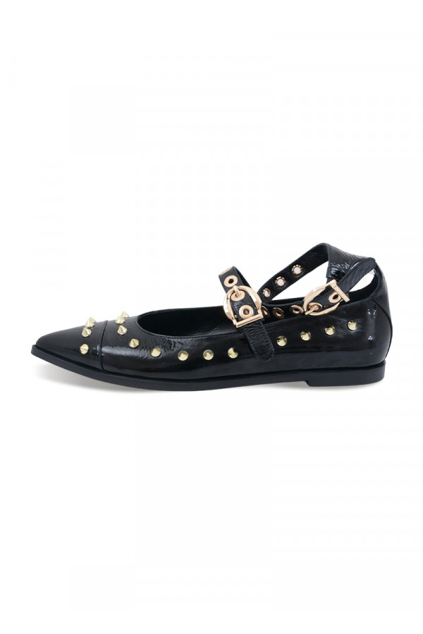 Opis: Kožne ženske ravne cipele u crnoj boji sa nitnama i kaiševima