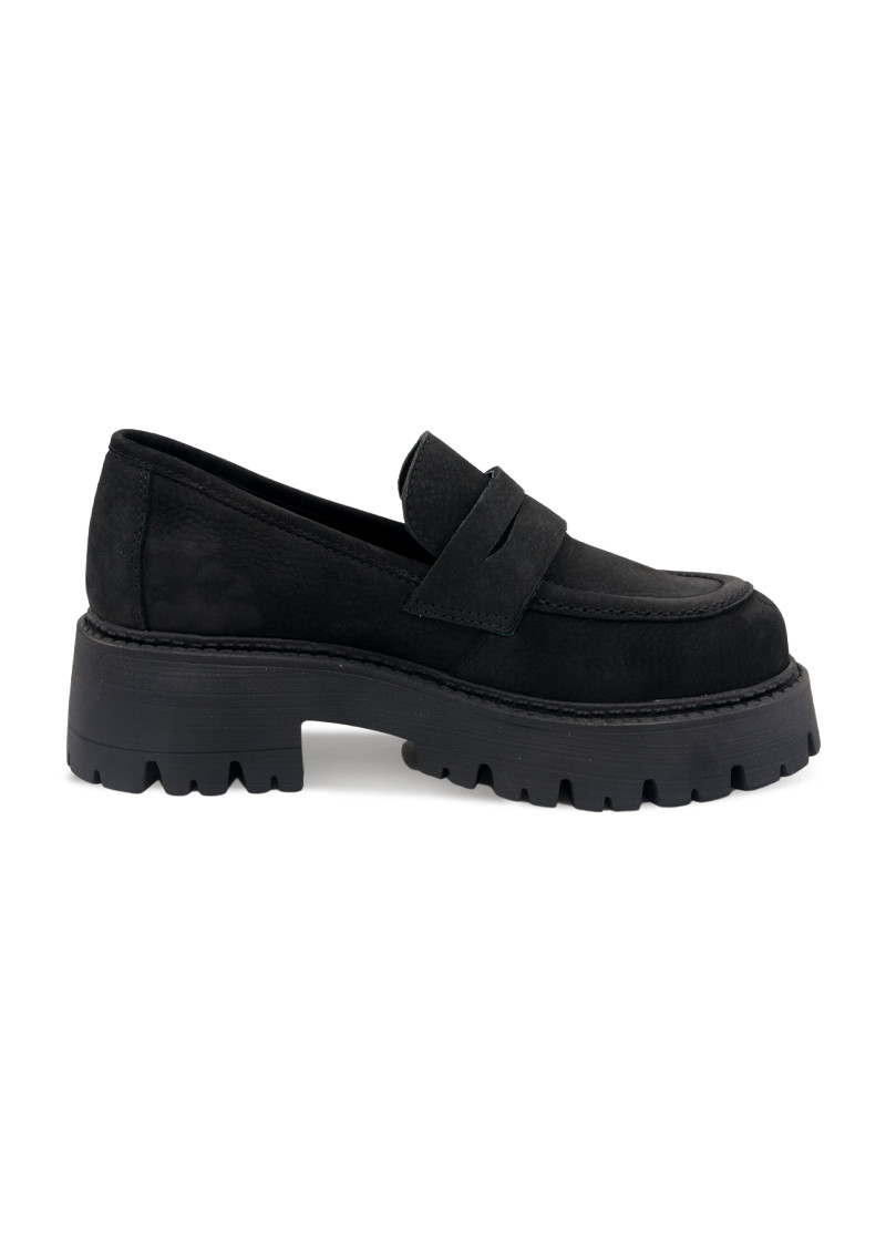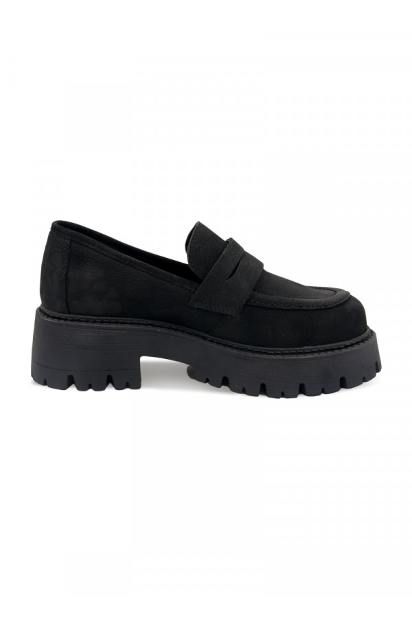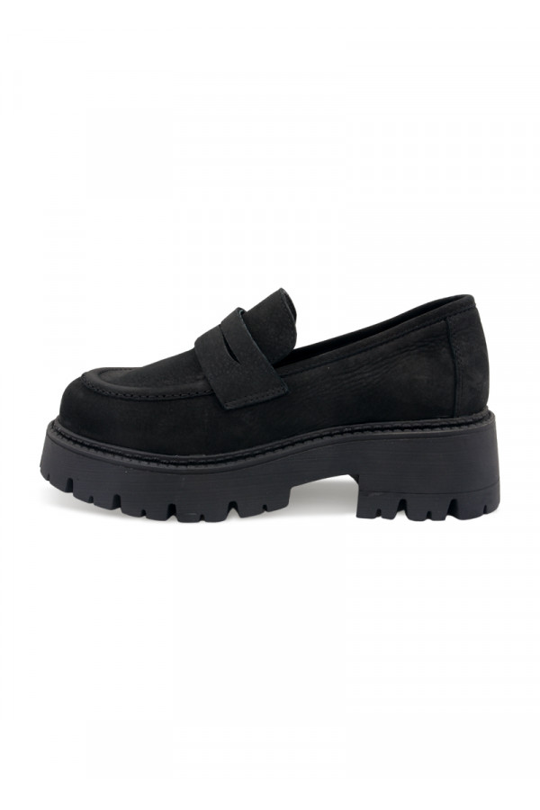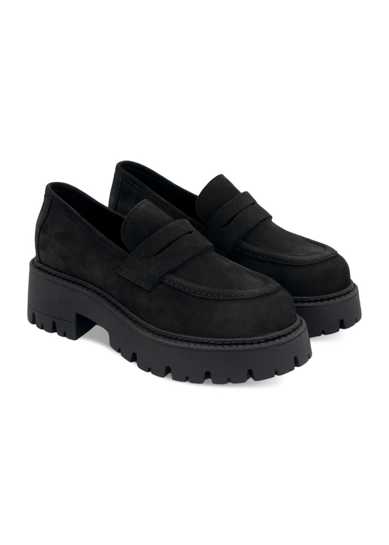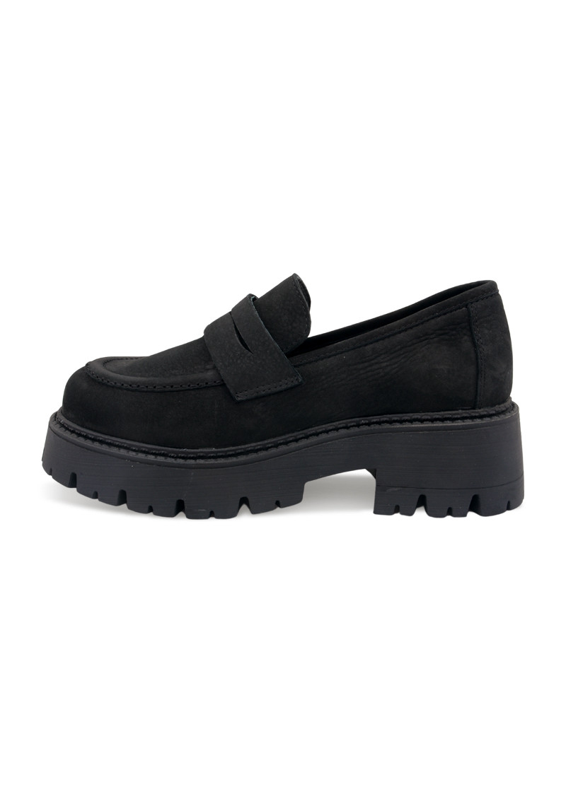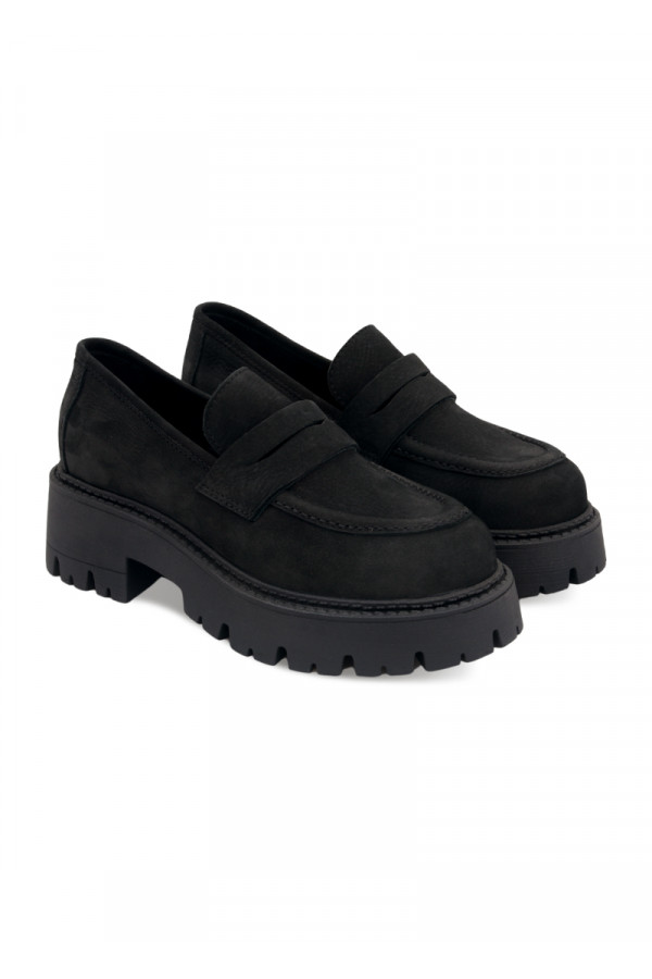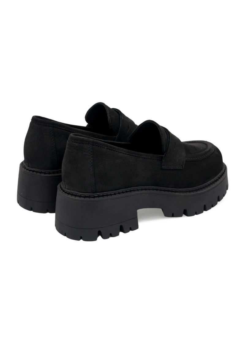 Opis: Ženske cipele od prevrnute kože u crnoj boji sa visokim đonom