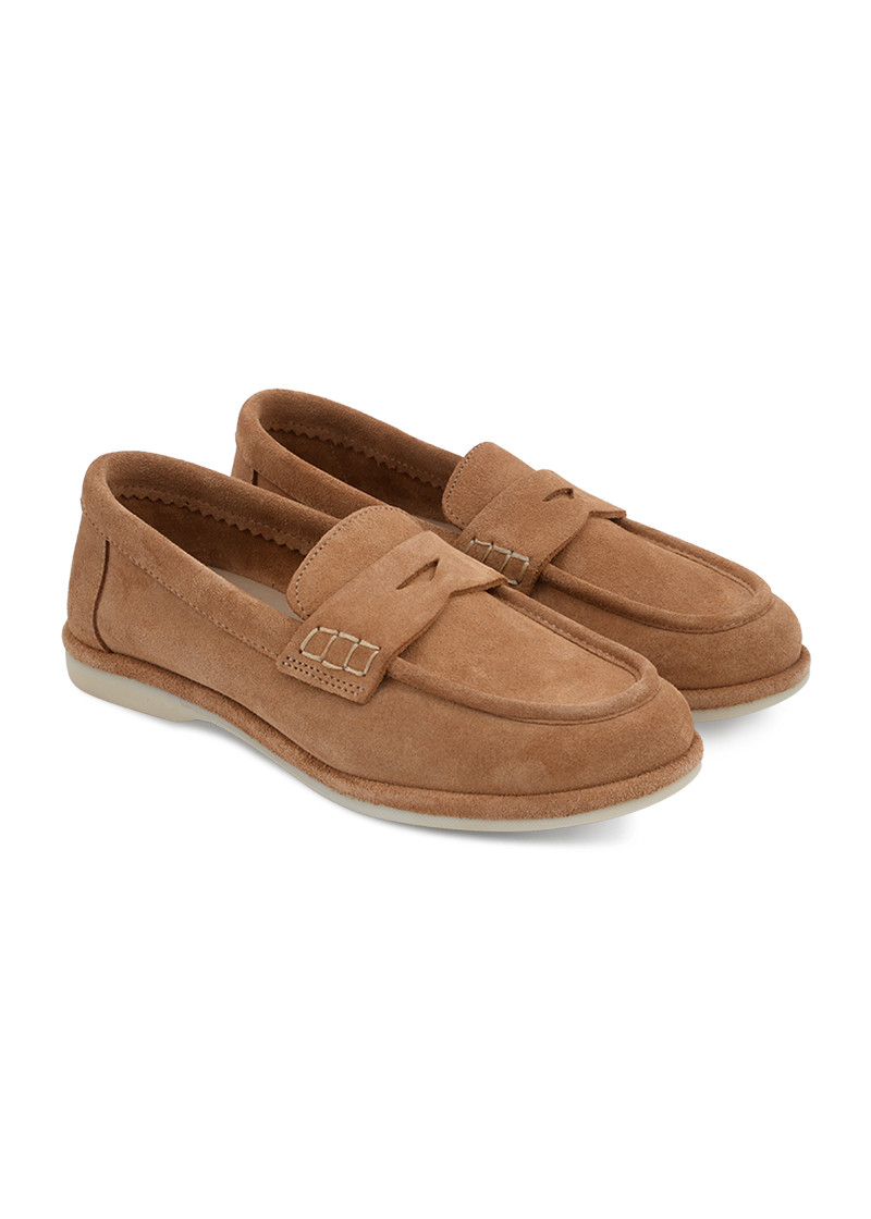 Opis: Ženske ravne cipele od prevrnute kože u kamel boji