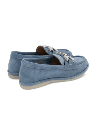 Opis: Kožne ženske ravne cipele u plavoj boji sa kristalima
