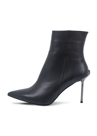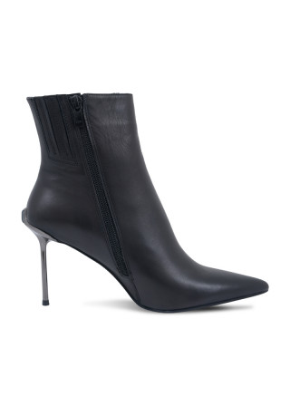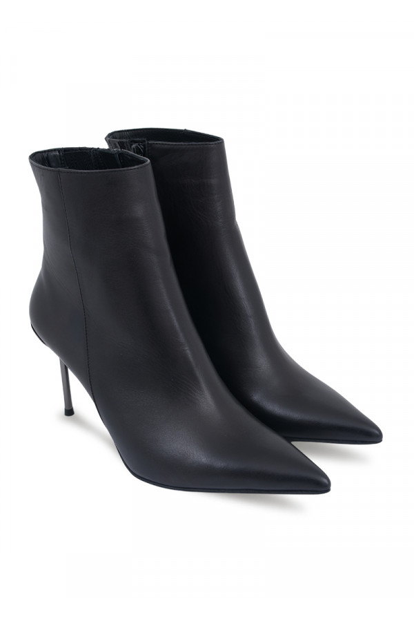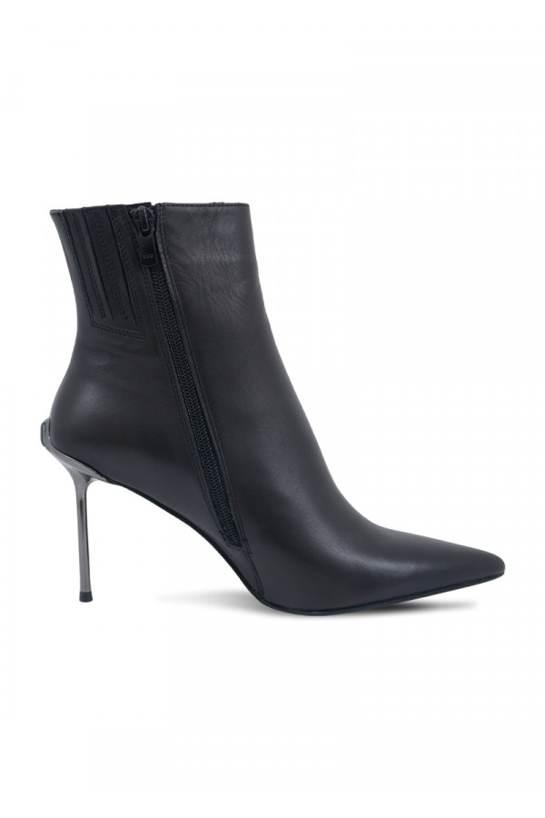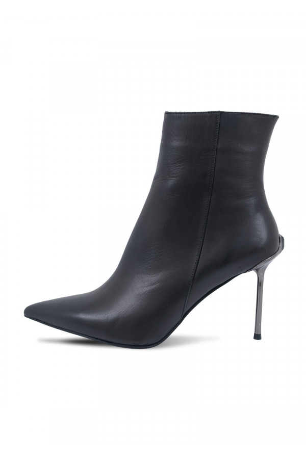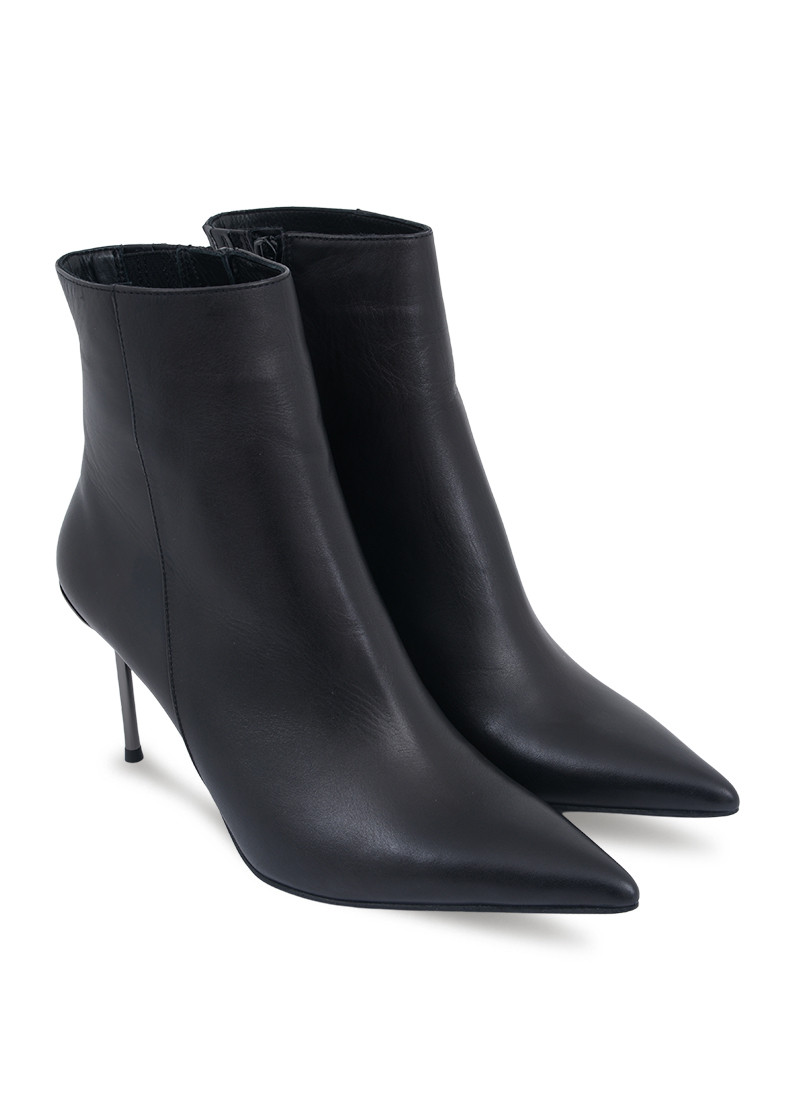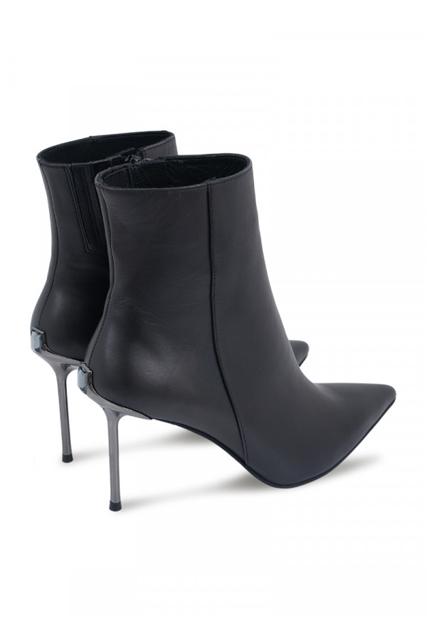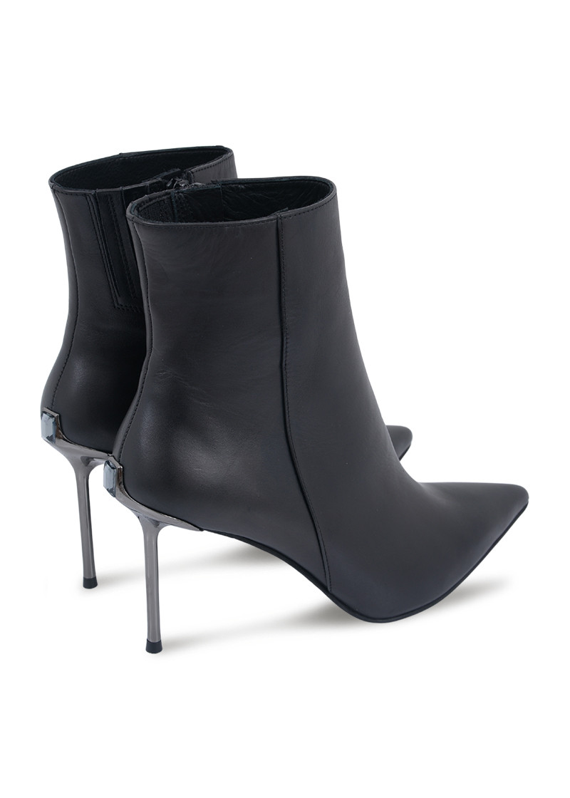 Opis: Kožne ženske poluduboke čizme u crnoj boji sa špicastim vrhom i metalik detaljem na peti