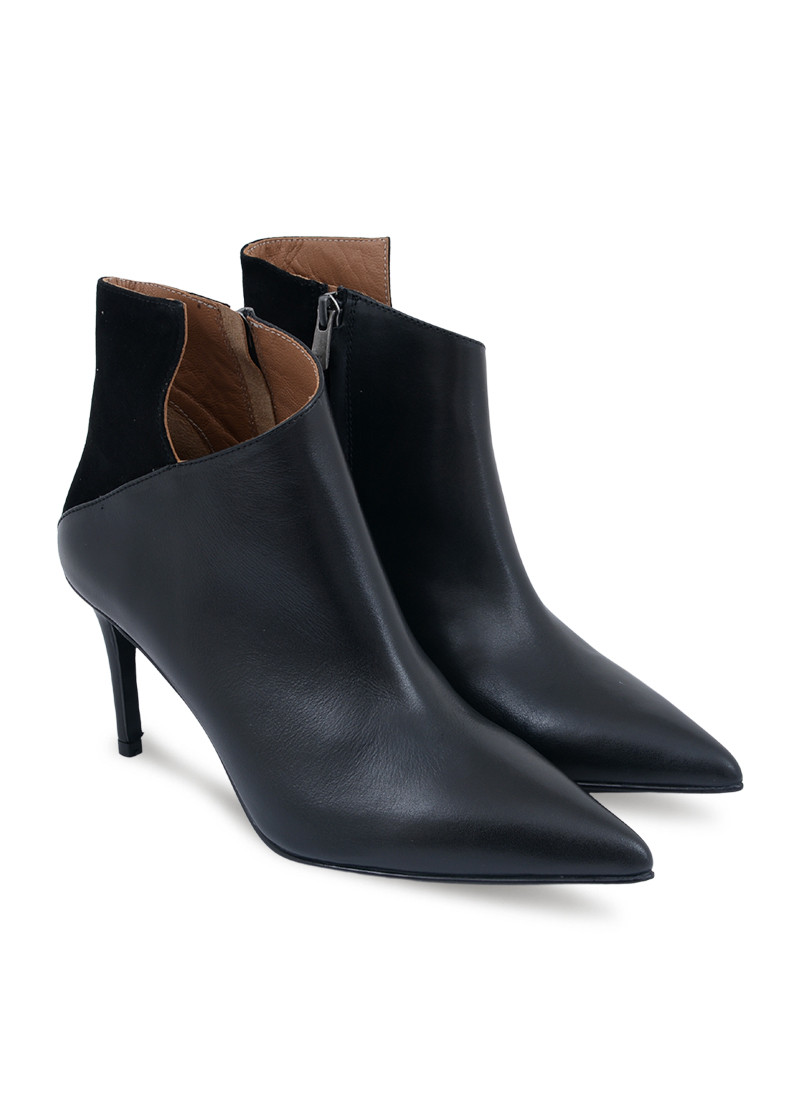 Opis: Ženske plitke čizme u kombinacije prevrnute i glatke kože u crnoj boji sa dijagonalnim sečenjem i bočnim zipom