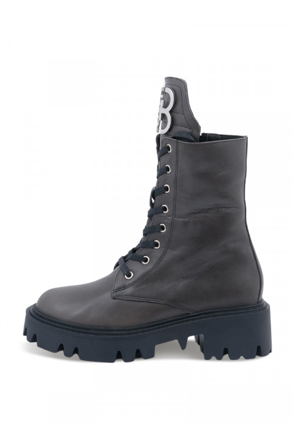Opis: Kožne ženske poluduboke ravne čizme u tamno sivoj boji sa bočnim zipom, pertlama i naglašenim đonom