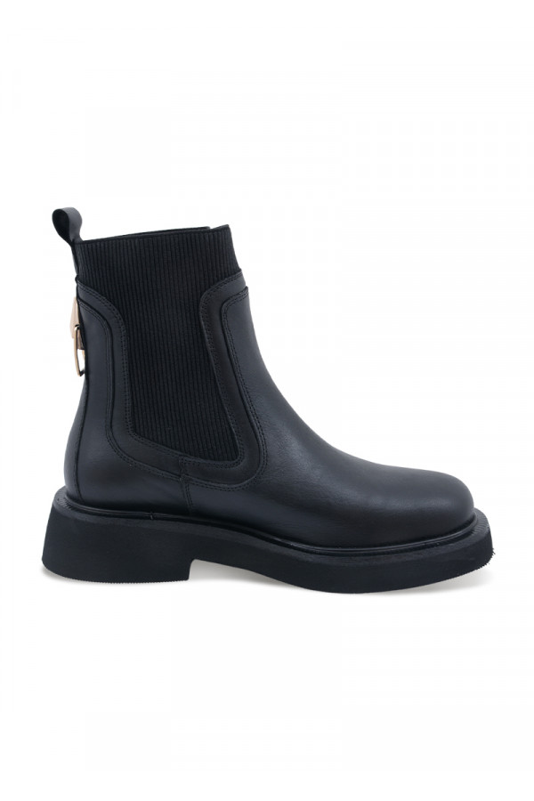 Opis: Kožne ženske poluduboke čizme u crnoj boji sa lastiš navlačenjem i metalnim priveskom
