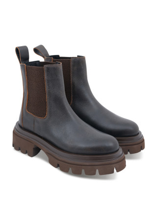 Opis: Kožne ženske poluduboke čizme u tamno braon boji sa bočnim lastiš trakama i visokim đonom