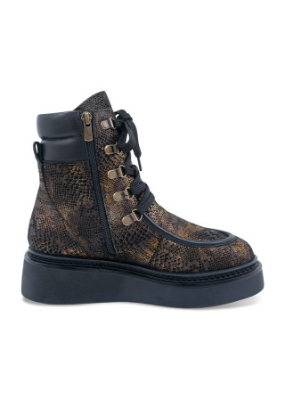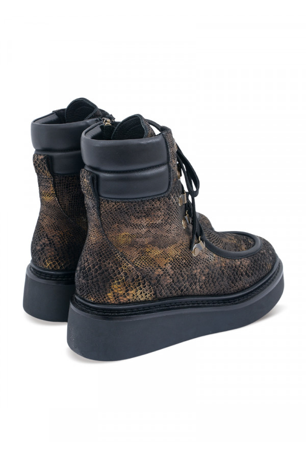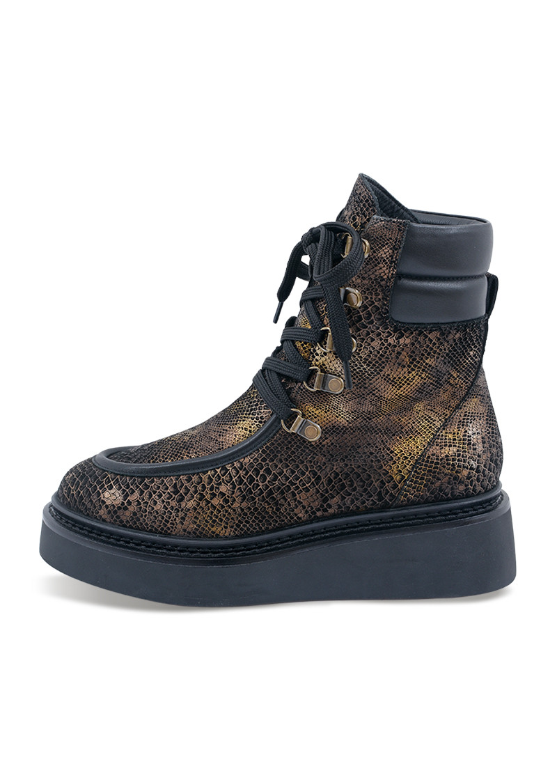 Opis: Kožne ženske ravne čizme u crnom animal printu sa metalik detaljima, pertlama i izdignutim đonom