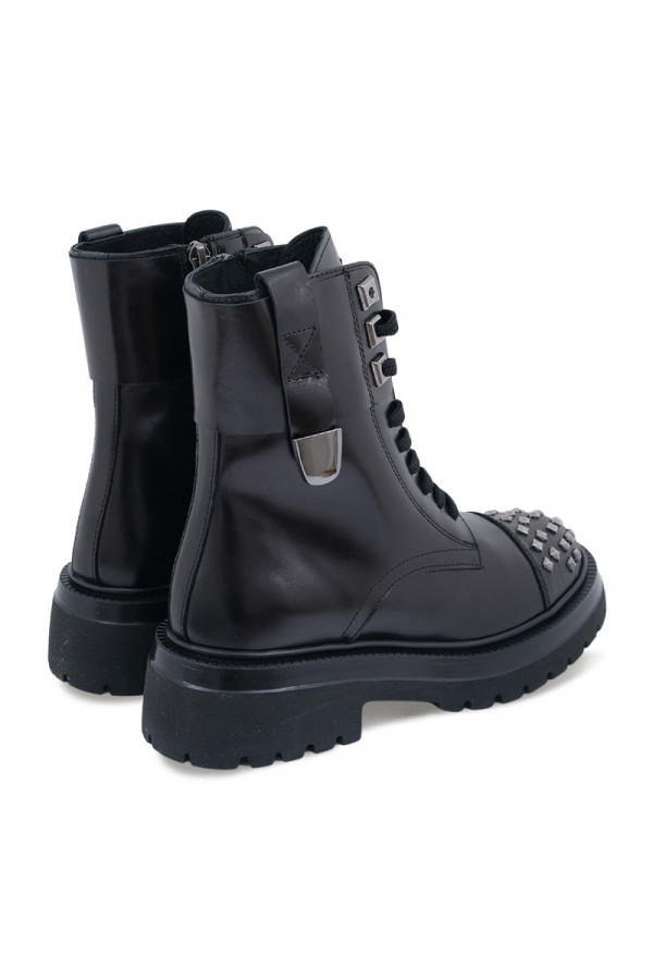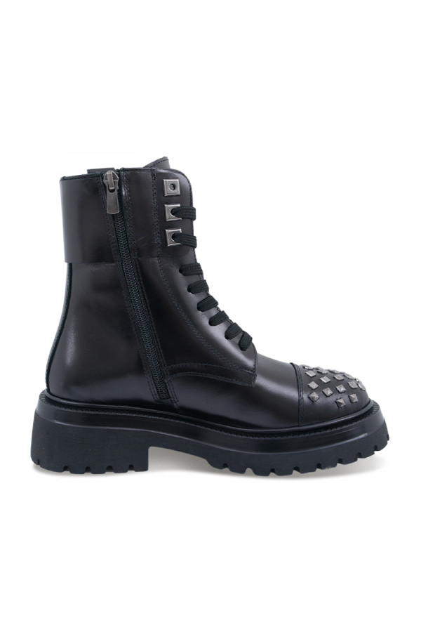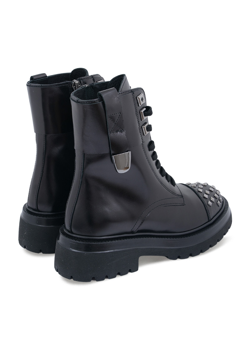 Opis: Kožne ženske ravne čizme u crnoj boji sa nitnama, pertlama i naglašenim đonom