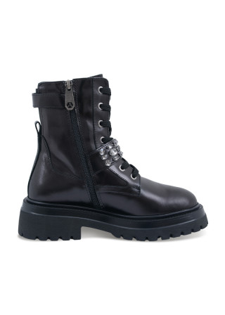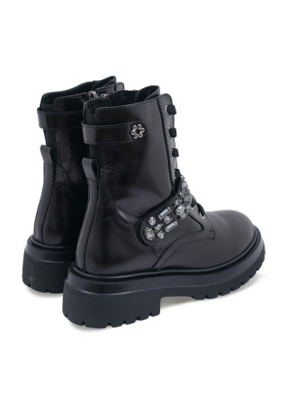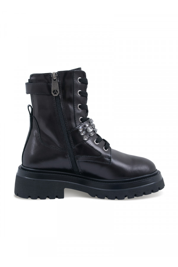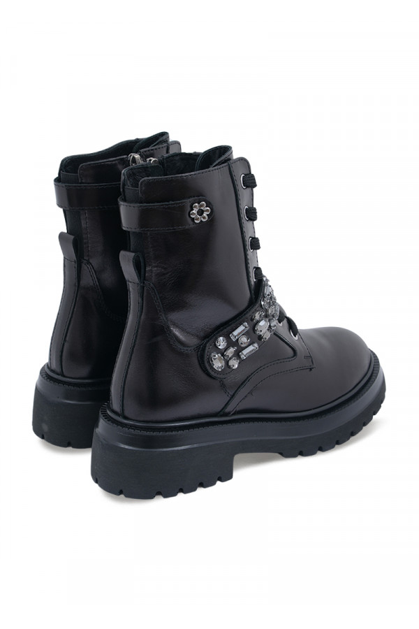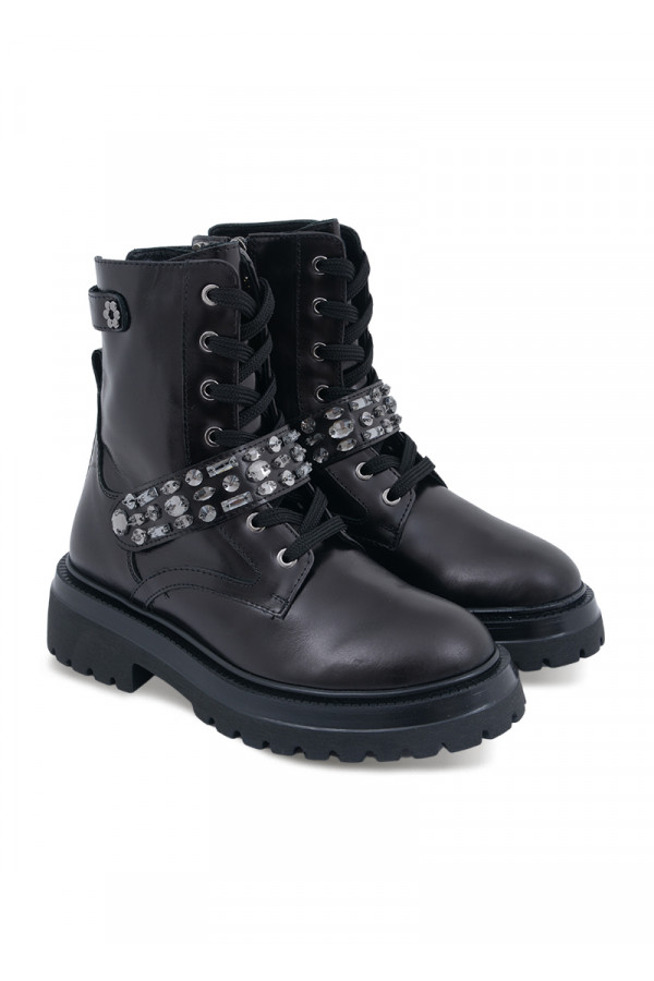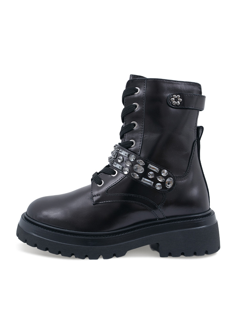 Opis: Kožne ženske ravne čizme u crnoj boji sa pertlama, ukrasnim kristalima i bočnim zipom