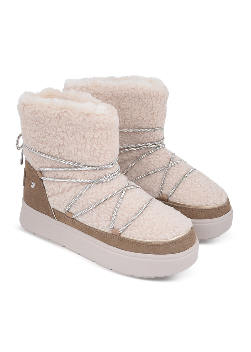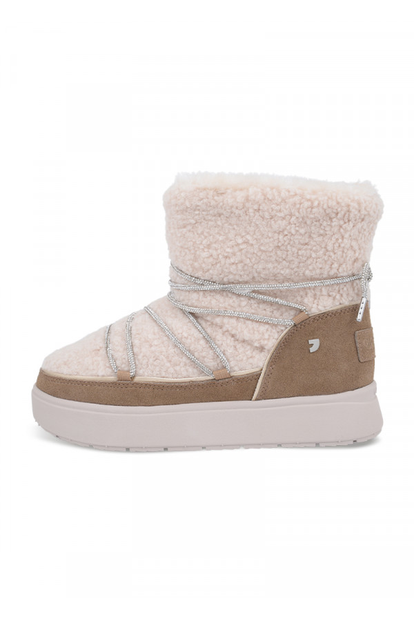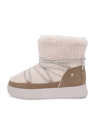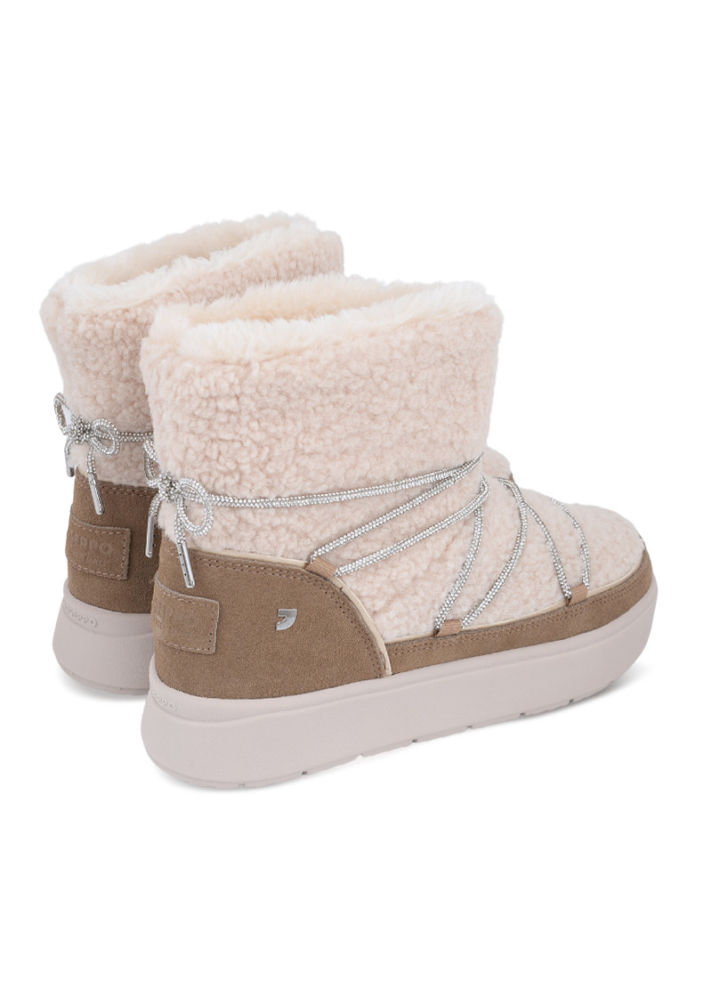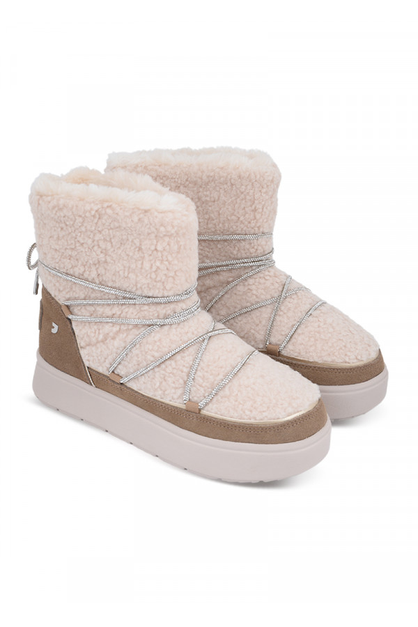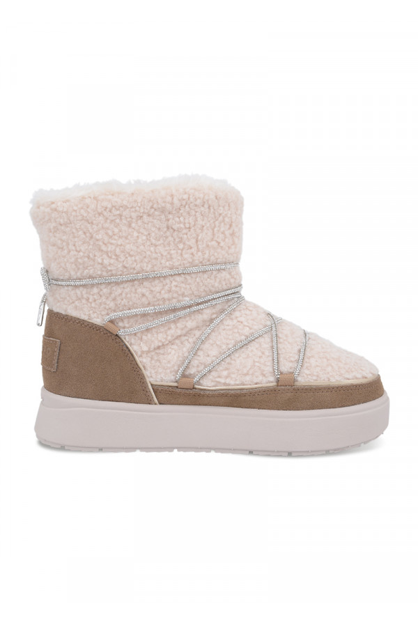 Opis: Ravne ženske čizme od veštačkog krzna u puder roza boji sa detaljima od kamel prevrnute kože, pertlama i povišenim đonom