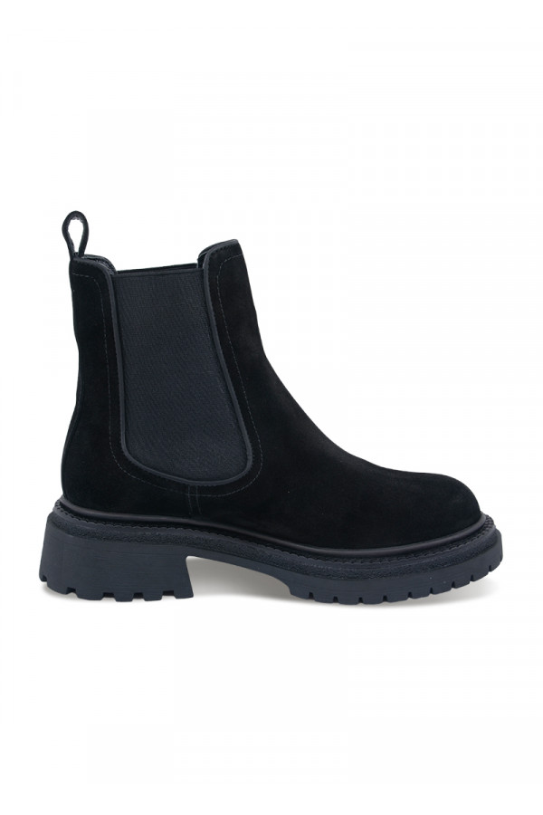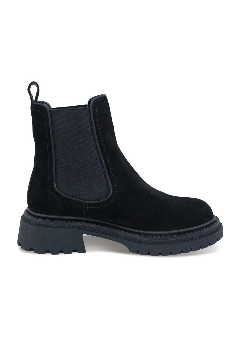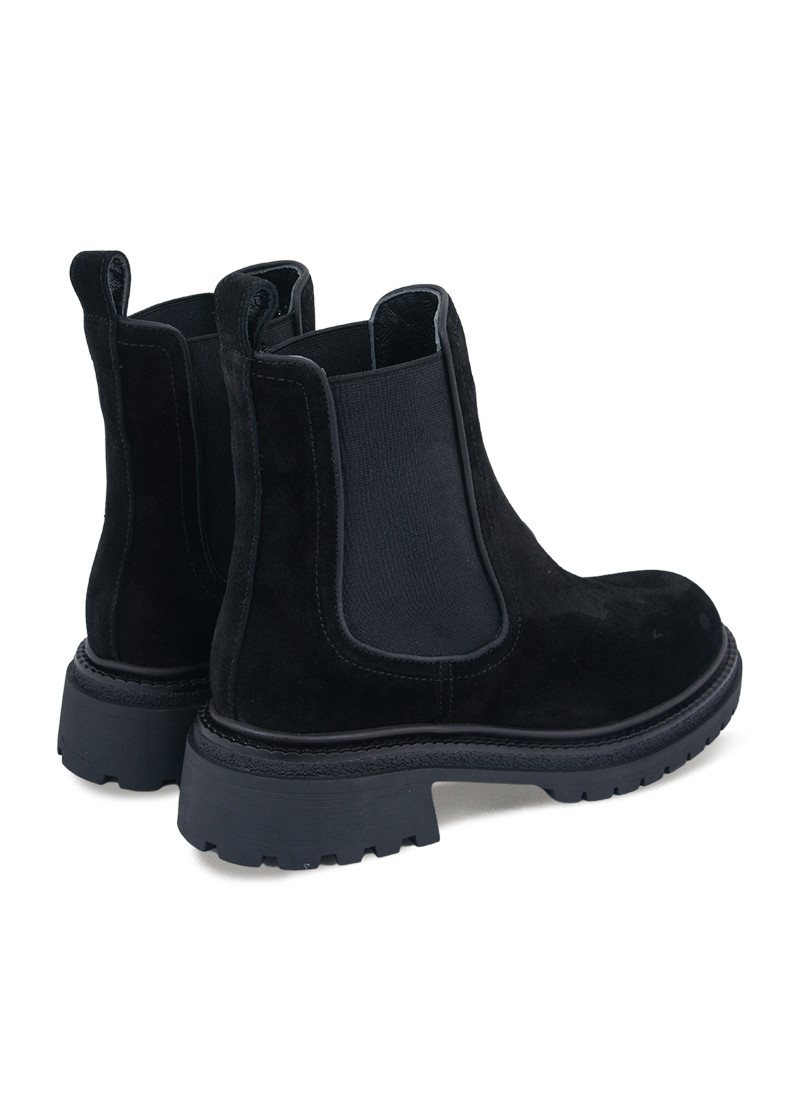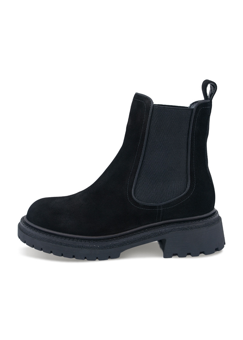 Opis: Ženske poluduboke čizme od prevrnute kože u crnoj boji sa naglašenom platforma đonom i bočnom lastiš trakom