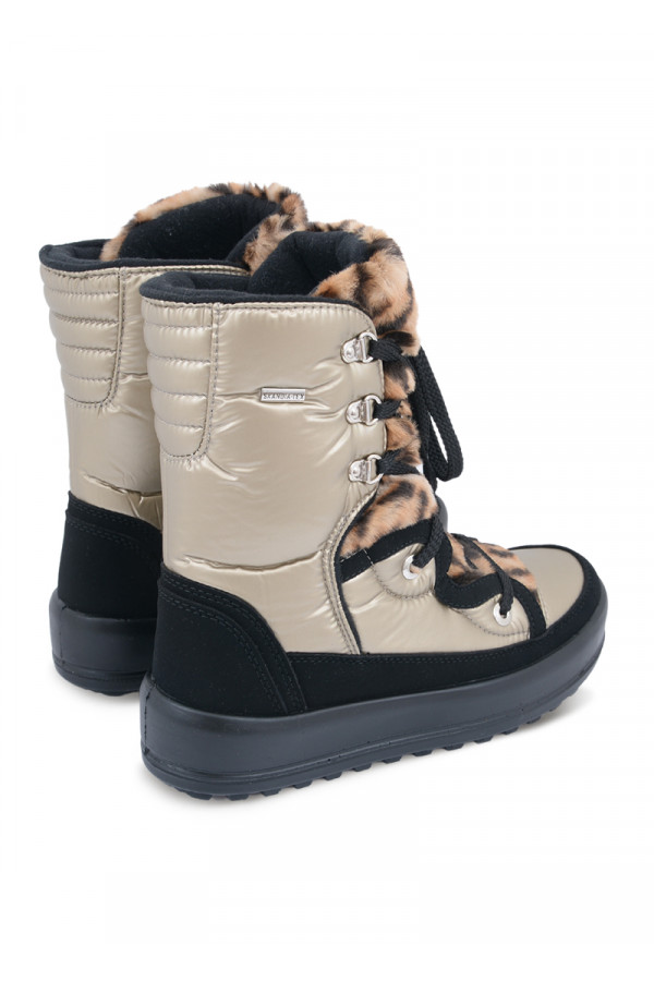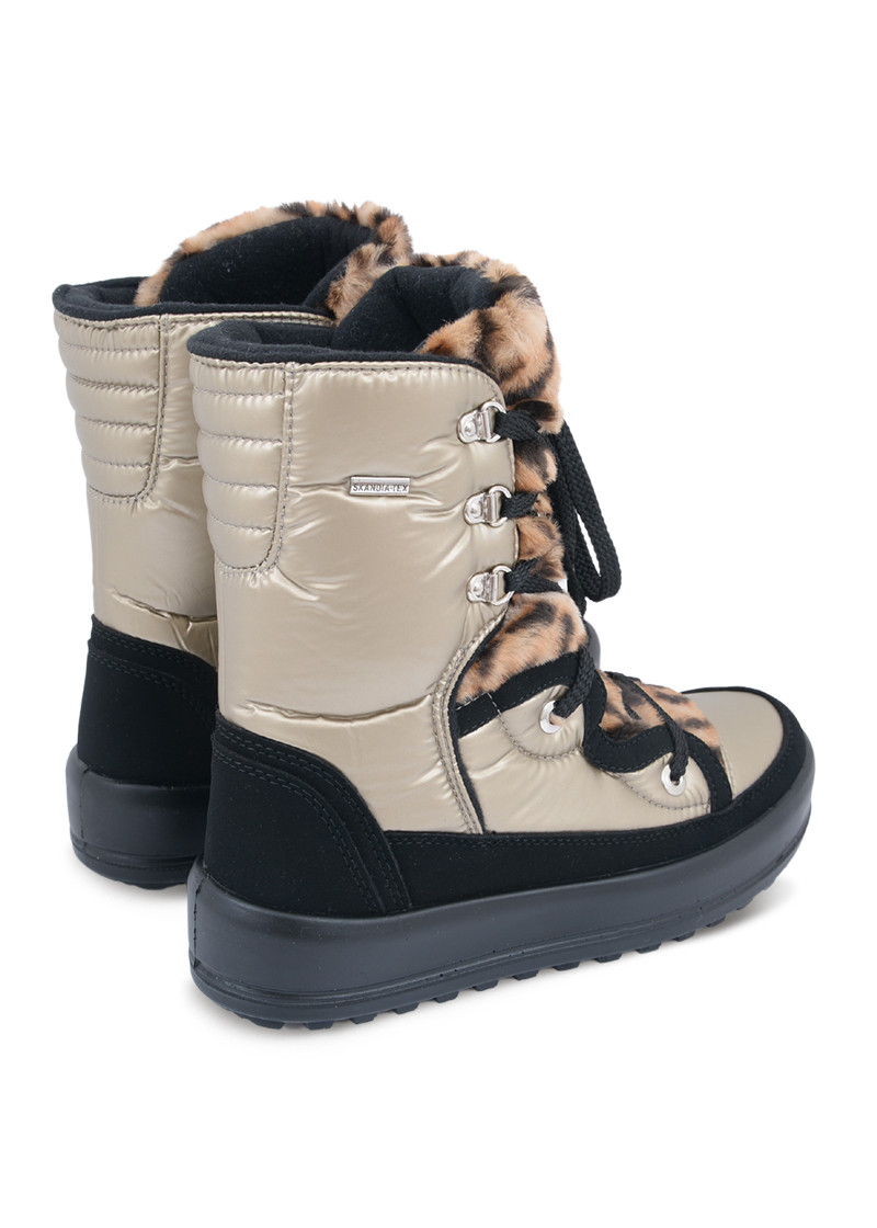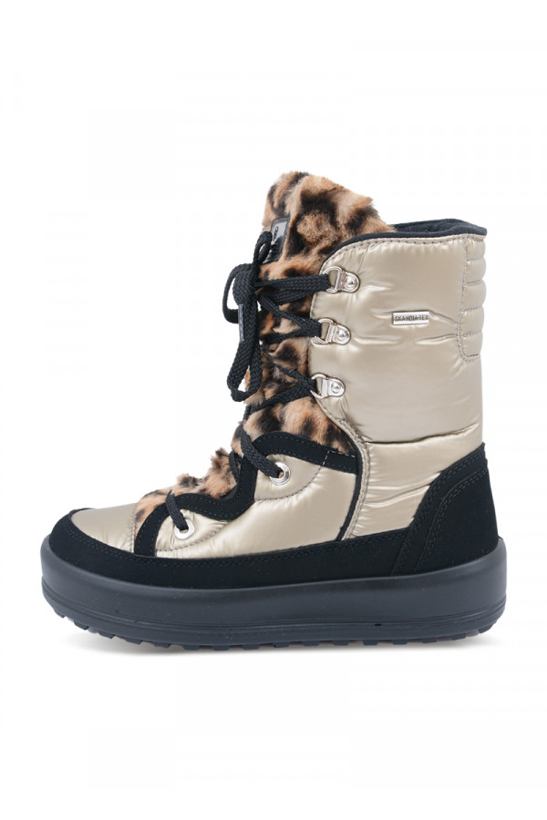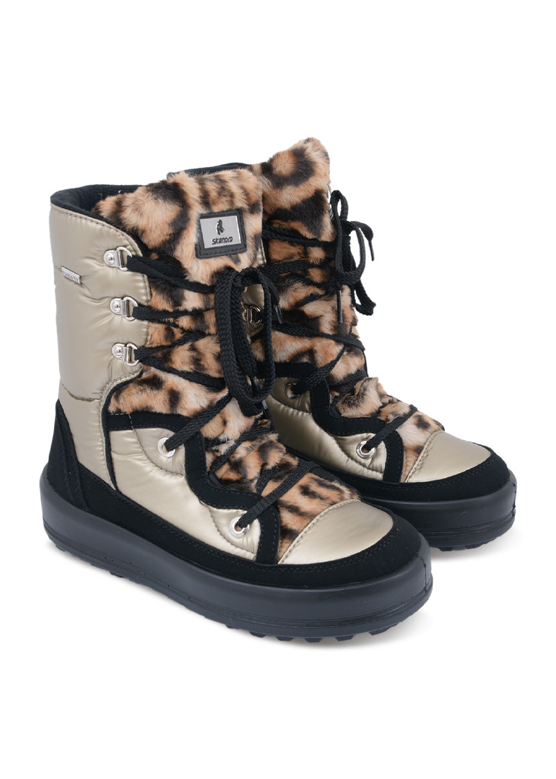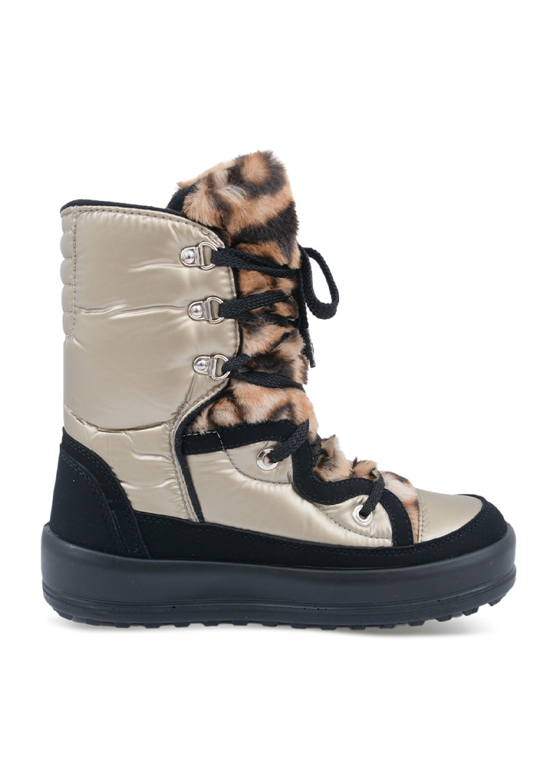 Opis: Ženske poluduboke zimske čizme u zlatnoj boji sa animal print detaljima i pertlama