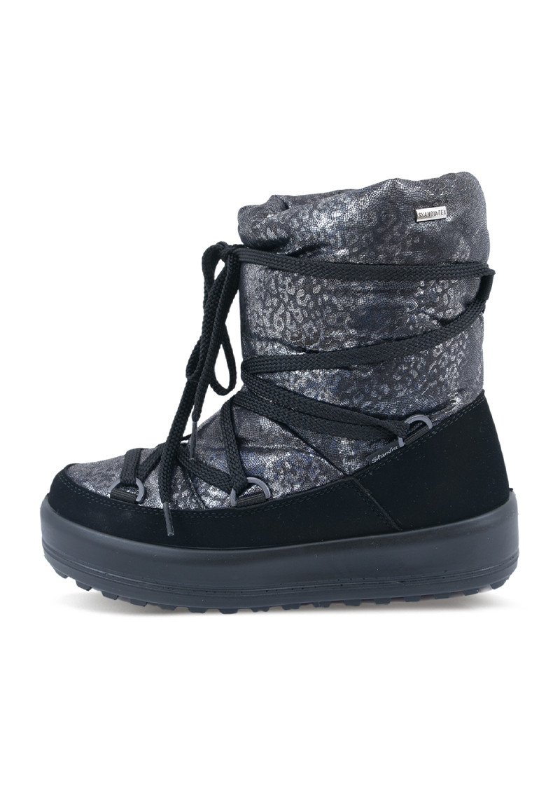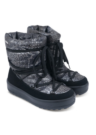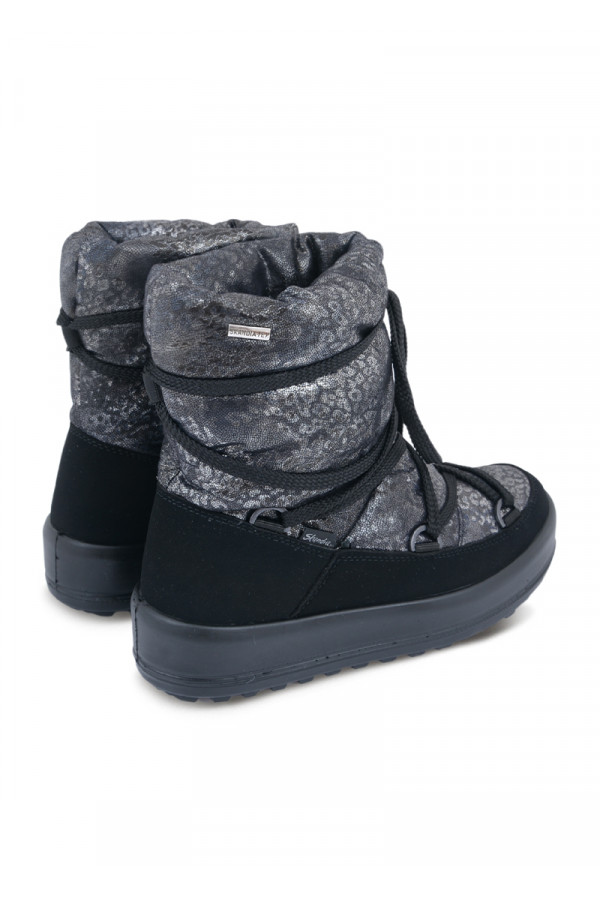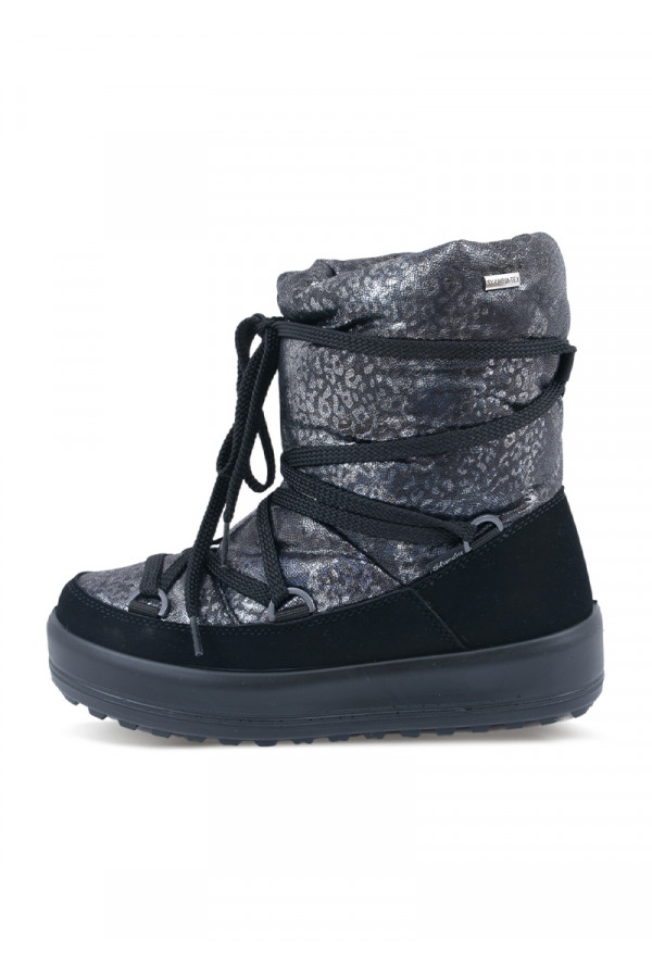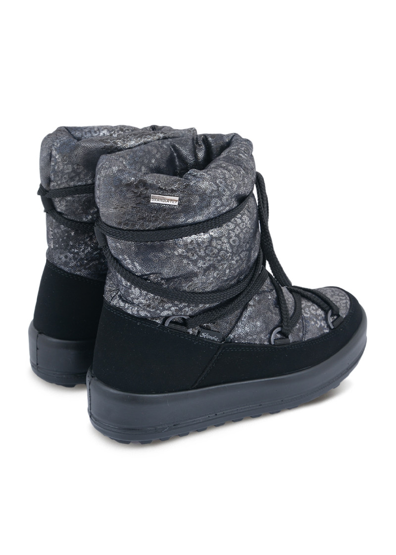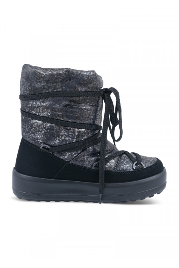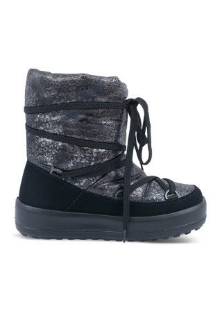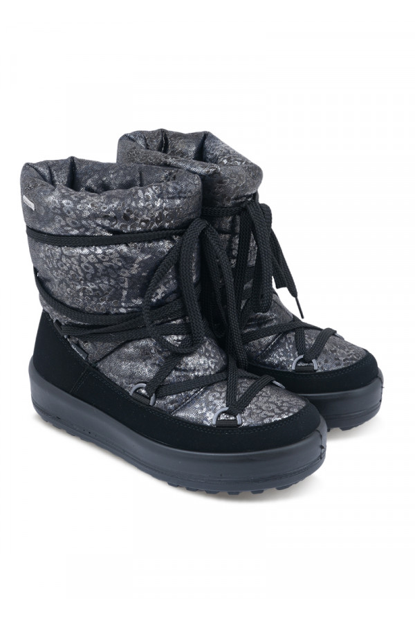 Opis: Ženske ravne čizme u kombinaciji crne i metalik sive boje sa pertlama